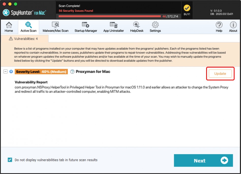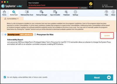 This tab displays a list of programs installed on your computer that may have updates available from the programs' publishers. Each of the programs listed may have been reported to have vulnerabilities. In some cases, publishers update their programs to repair known vulnerabilities. Addressing these vulnerabilities will be based on whatever program updates the software publisher publishes and/or has available at the time of your scan. You may wish to manually update a program by clicking the "Update" button, located at its right. After clicking the button, you will be directed to download available updates from the publisher.
