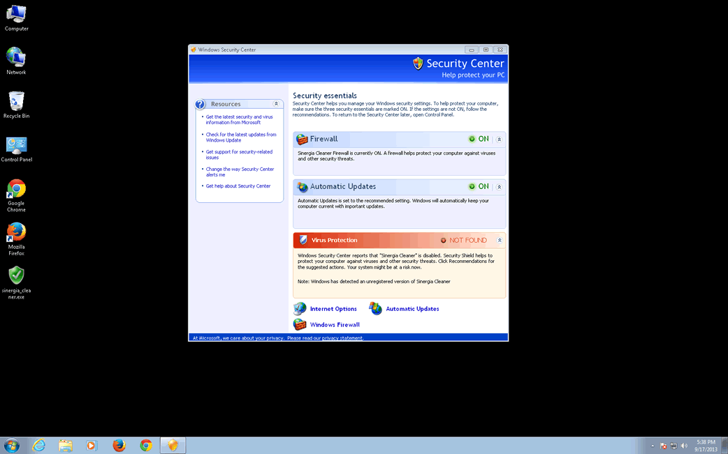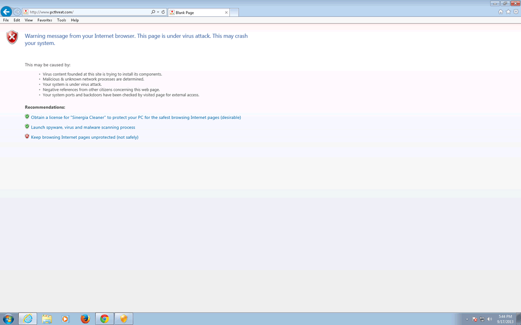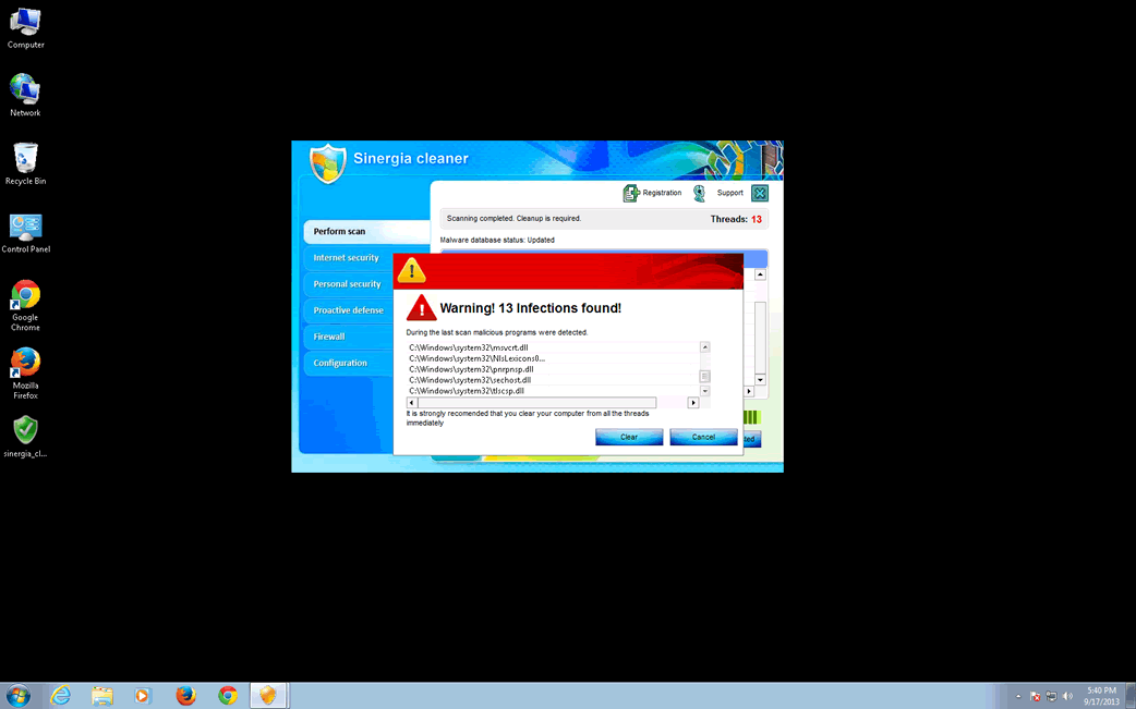 You should remove Sinergia Cleaner immediately with the help of a strong, reliable, fully updated anti-malware application. You should avoid paying money for anything related to Sinergia Cleaner and its numerous clones that include System Security, Antivirus Security, Total Security 2009, Security Tool, Trojan.RogueAV.a.gen, System Adware Scanner 2010, FakeAlert-KW.e, Advanced Security Tool 2010, System Tool 2011, Security Shield, MS Removal Tool, Total Security, System Security 2011, Essential Cleaner, Security Shield Pro 2011, Personal Shield Pro, Security Shield 2011, Security Sphere 2012, Advanced PC Shield 2012, Futurro Antivirus.