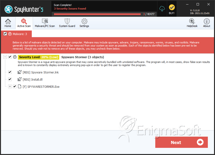 SpywareStormer is a potential security threat that generates exaggerated reports of malware on a compromised PC. SpywareStormer will display excessive pop-up windows and security alerts informing the user that he/she is infected and the solution is to purchase a registered version of its software. SpywareStormer can be removed with a good anti-spyware program.