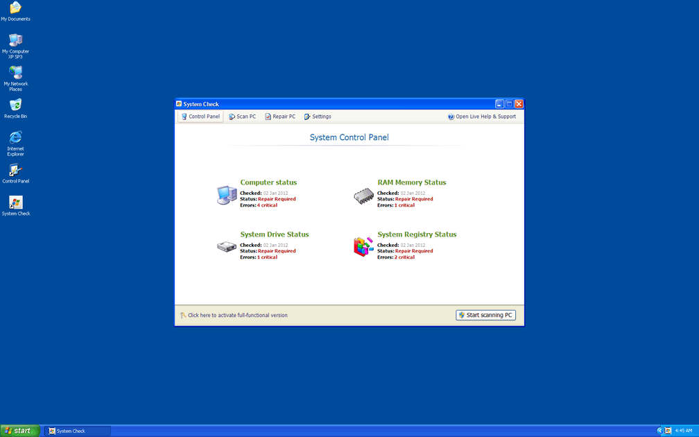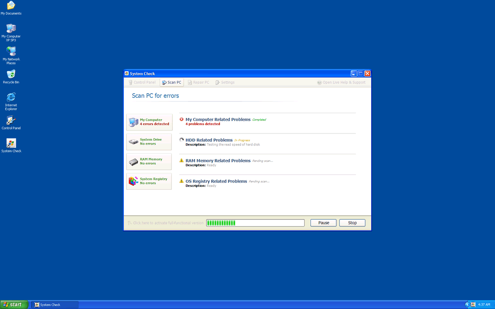 System Check is a rogue PC defragmenter. System Check belongs to a family of rogue defragmenters known as FakeSysDef, which are typically disguised as system optimization tools or defragmenters. While System Check claims to be able to solve problems in your hard drive, System Check is actually designed to scam inexperienced users by convincing them to purchase a license for a useless 'full version' of this malicious scam. According to ESG security researchers, System Check is closely linked to various Trojan infections. Because of this, failure to remove System Check and its associated malware from your computer system will cause a number of severe problems with your computer's normal operation. This is because System Check makes dangerous changes to your computer's registry, as well as dropping various malicious executable files. Another reason why System Check is harmful to your computer is that the Trojan that brought System Check will typically exploit security vulnerabilities on your computer in order to install itself against your will, making your computer particularly vulnerable to further intrusions. ESG malware analysts strongly advise removing System Check immediately with the help of a reliable anti-virus program. Most importantly, do not pay heed to any of System Check's messages or alerts; these are all part of its scam.