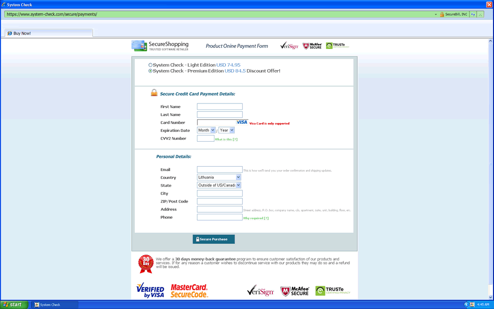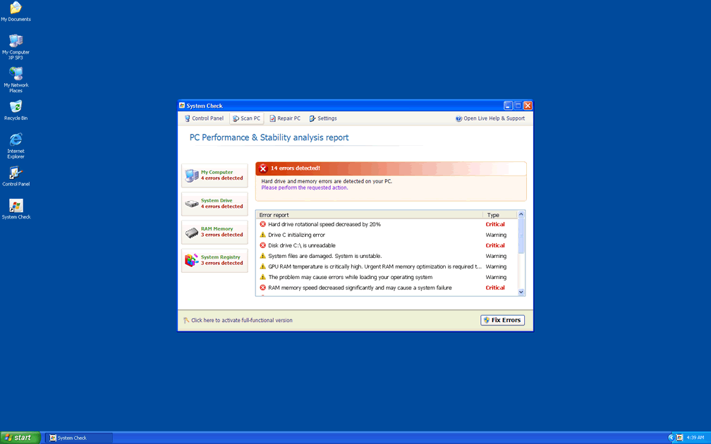 System Check is designed to display a constant barrage of fake alert messages claiming that there are critical errors in the infected computer's hard drive. These messages may claim that your RAM usage is too high, and there has been a RAM memory failure or that your computer cannot read system files. These claims should be ignored, since they are designed to make you panic. The reason why System Check tries to make you panic is so that you will buy System Check in order to fix these imaginary problems. However, handing over your money to criminals behind System Check is practically the same as simply throwing your money into the garbage. Typical symptoms of a System Check infection include browser redirects, poor system performance, frequent crashes and the non-stop stream of alarming messages and bogus system alerts. If your computer system is exhibiting any of previously mentioned symptoms, it is a very clear sign that your PC has become infected with a rogue defragmenter. Take steps to protect yourself from this malware infection immediately.![]()