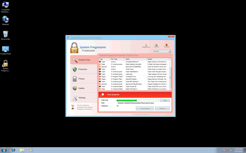 Basically, System Progressive Protection is designed to convince computer users to spend money on a fake upgrade for this already useless application. To do this, System Progressive Protection will pretend that the victim's computer has been invaded with a variety of viruses and Trojans. This fake security program harasses the victim with numerous fake error messages and alarming system pop-up notifications, all meant to make inexperienced computer users panic into paying for this useless 'full version' of System Progressive Protection.