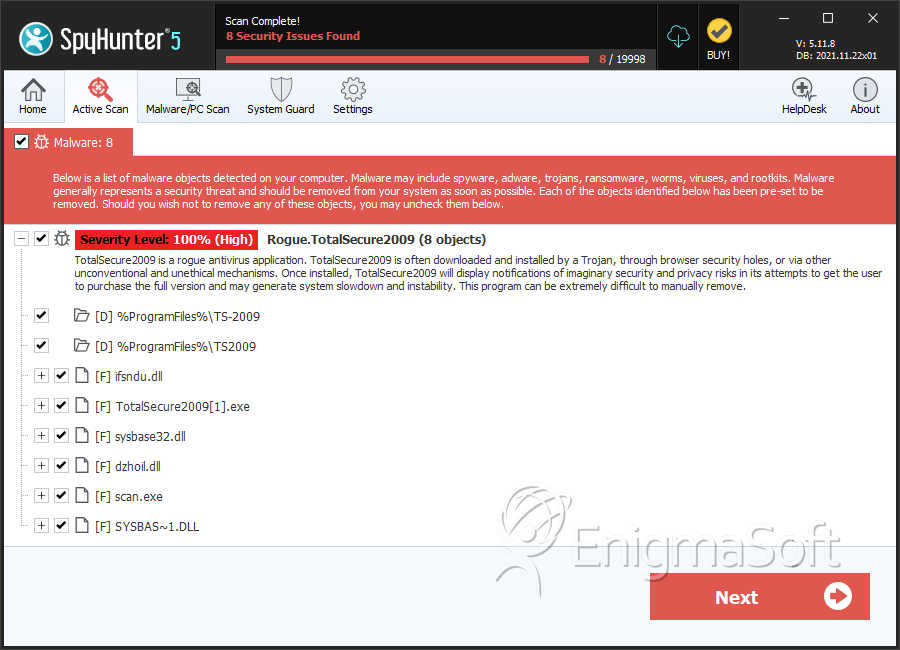 Total Secure 2009, TotalSecure2009 or TotalSecure 2009, is a rogue anti-spyware application. Total Secure 2009 may be installed into the user's computer system with the help of a Trojan called Zlob found in fake video codecs or by clicking on a download link from a malicious domain. Total Secure 2009 is also propagated through spam emails. In addition, Total Secure 2009 generates fake scan results stating that it has detected spyware in order to trick the user into purchasing the program. Total Secure 2009 is a clone of IE Antivirus, IEDefender, Malware Bell and Files Secure.
