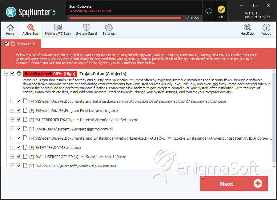 Trojan.Potao.A is a mischievous Trojan infection that is downloaded to your computer system by other malware threats; so if you have Trojan.Potao.A on your computer system, many other infections probably exist on your PC. Trojan.Potao.A can be detected as a risky DLL component. Trojan.Potao.A has lots of its related processes. Trojan.Potao.A can invade your privacy and download additional parasites to your computer. Get rid of Trojan.Potao.A as quickly as possible by using a legitimate security application.