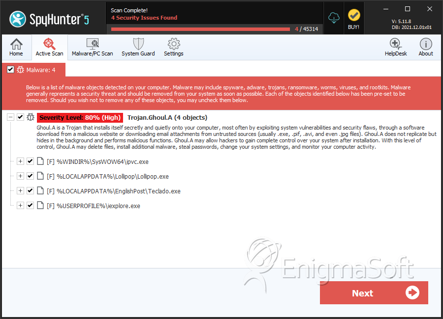 Ranking: The ranking of a particular threat in EnigmaSoft’s Threat Database.