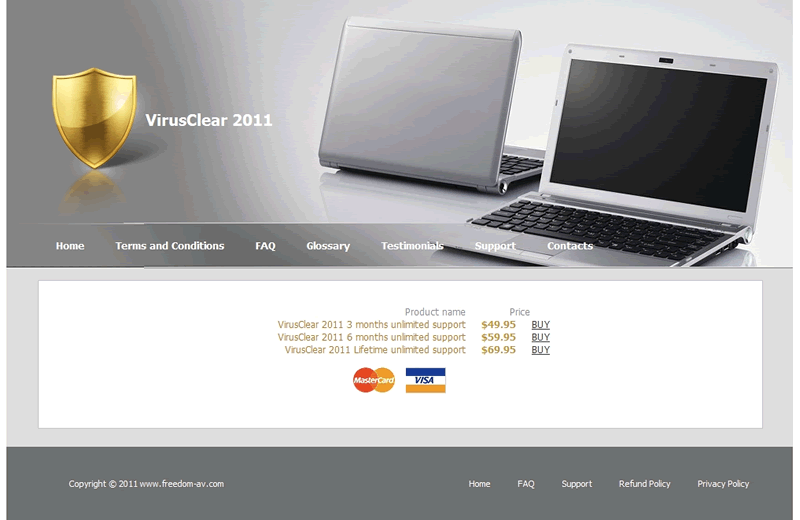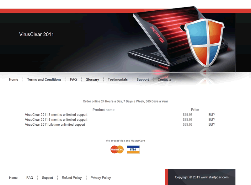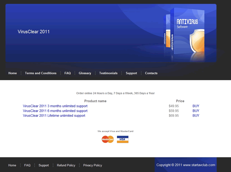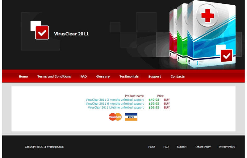 These websites are constructed just like any other payment page associated with a rogue anti-virus program. The idea with one of these rogue anti-virus applications is that it infects a computer without the user's knowledge, and then when it becomes active, the malware uses a combination of ransoming and scare tactics to try to drive the user of the affected computer to pay for the malware as if it were real antivirus software. To do this, these fake software scams have multiple identical (or nearly identical) payment sites, which usually include the bare minimum in text and layout in order to look realistic. They frequently offer a few different "tiers" of service for the fake software, which can be paid for by credit card. The suspicious websites have the following price options for VirusClear 2011: