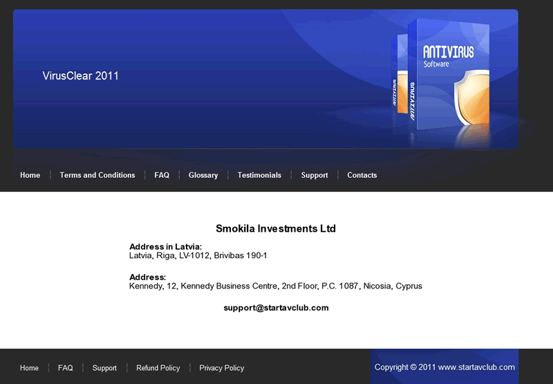 So not only do all ten of Virus Clear 2011's domains trace back to the same name and address, but they trace back to 24ruhost. This puts the last nail in Virus Clear 2011's coffin, as 24ruhost is notorious for hosting many of the widespread rogue anti-virus application scams that are currently plaguing the Internet. No legitimate anti-virus software company would trace back to 24ruhost.