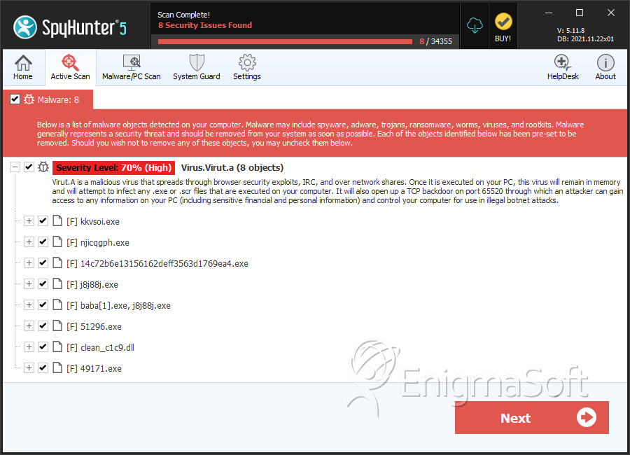 Virus.Virut.A is a nasty virus that spreads through browser security exploits, IRC, and over network shares. Once it is executed, Virus.Virut.A will hide deeply in memory and will try to infect any .exe or .scr files that are executed on your machine. Virus.Virut.A will also attempt to open up a TCP backdoor on port 65520 so that the remote attacker can gain access to any information on your computer. This places any financial or banking information stored on your computer in severe jeopardy and represents a serious security risk.