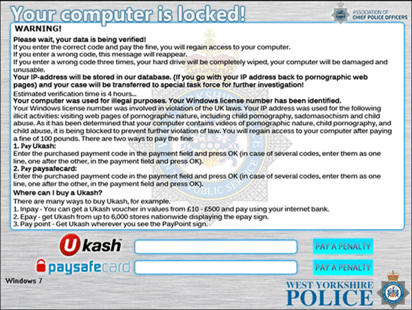 West Yorkshire Ransomware, also known as West Yorkshire Police virus, mainly affects UK computer users but PC owners in other countries could also be affected. The misleading West Yorkshire pop-up message is triggered by a ransomware Trojan, which blocks computer owners from accessing the desktop by showing a tricky pop-up alert. West Yorkshire Ransomware is also a counterpart of the fake Metropolitan and Scotland Yards Police Virus. The deceptive West Yorkshire pop-up alert speaks in the name of the UK official security authority and blames victims for violating the UK law. The falsified West Yorkshire pop-up notification demands ransom from the victim to unlock the computer. Do not be intimidated by the confusing West Yorkshire pop-up warning because it is used as a mean to rip PC users off. To avoid the annoying West Yorkshire pop-up message, you should remove a ransomware Trojan with a reputable anti-virus program.
