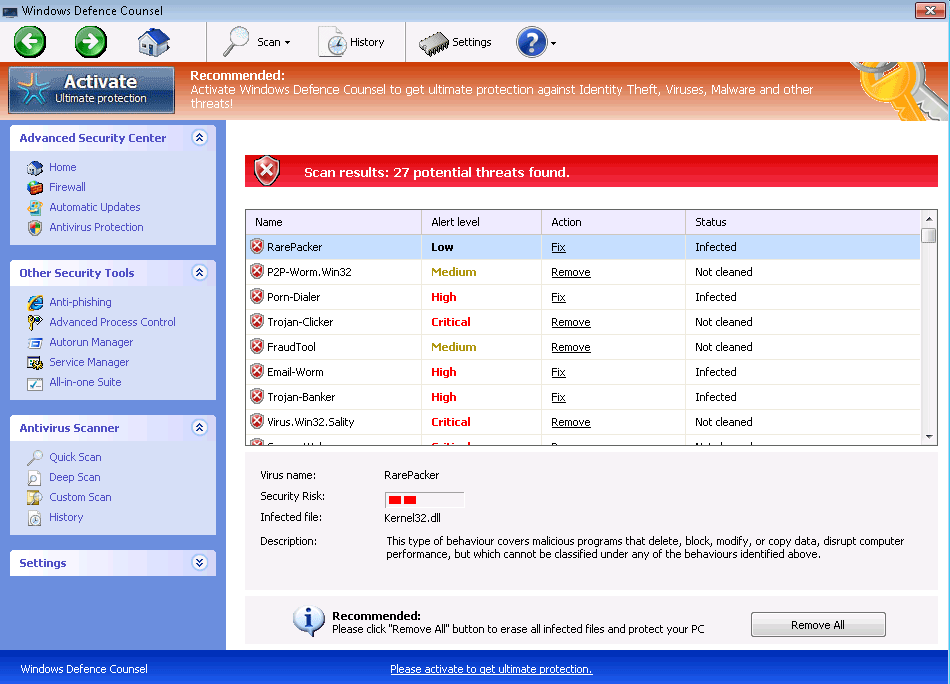 The FakeVimes family of malware has been active since 2009. Windows Defence Counsel belongs to a variety of malware in the FakeVimes family that was first seen in late 2011 and that has been very active in 2012. Examples of these fake security programs include Virus Melt, Presto TuneUp, Fast Antivirus 2009, Extra Antivirus, Windows Security Suite, Smart Virus Eliminator, Packed.Generic.245, Volcano Security Suite, Windows Enterprise Suite, Enterprise Suite, Additional Guard, PC Live Guard, Live PC Care, Live Enterprise Suite, Security Antivirus, My Security Wall, CleanUp Antivirus, Smart Security, Windows Protection Suite, Windows Work Catalyst.