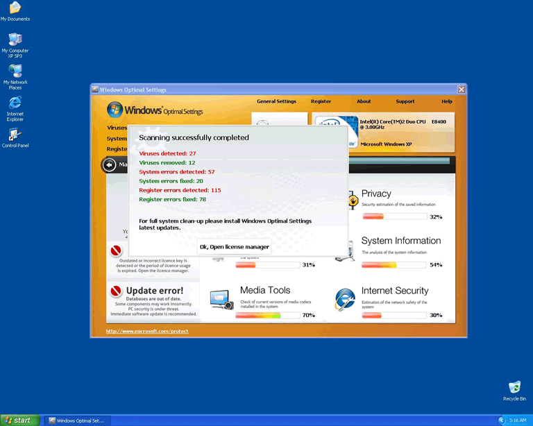 All scare tactics aside, Windows Optimal Settings will try to manipulate you by holding your computer hostage. It does this by preventing you from running other programs, and may even redirect your web browser to prevent you from seeing anything other than its own malicious website. It is very important to note, by the way, that paying for Windows Optimal Settings will not get it to leave you alone, either. It has to be removed.