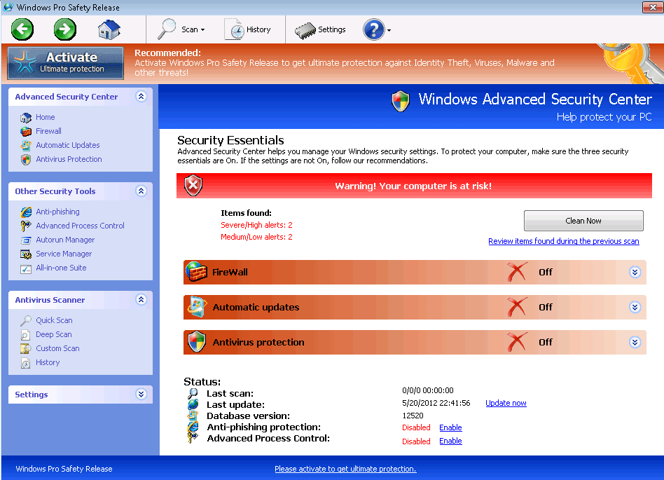 Windows Pro Safety Release is a fraudulent security program. While Windows Pro Safety Release has the external appearance of an actual anti-virus application, at its core it has no actual anti-malware components; Windows Pro Safety Release is designed to execute a well-worn online scam. The Windows Pro Safety Release scam consists in making the victim believe that their computer system is severely infected with viruses and Trojans. Then, Windows Pro Safety Release will claim that a 'full version' must be purchased in order to remove these non-existent threats. Windows Pro Safety Release's supposed upgrade is not cheap ($99 USD), and considering that it is absolutely useless, ESG malware analysts strongly recommend against purchasing this fake security program. Instead, Windows Pro Safety Release should be removed with a real, fully updated anti-malware tool.