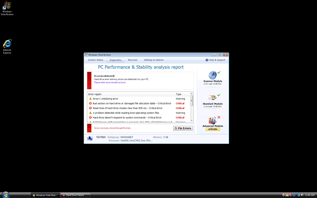 Windows Vista Restore is part of a trio of rogue anti-spyware programs thought to originate in the Russian Federation, and to have been released in 2012. Known clones of this program are Windows XP Restore and Windows 7 Restore, each designed to look as natural as possible in the corresponding operating system. Windows Vista Restore is part of a family of malicious programs known as scareware. These are meant to scare users into providing their credit card information by provoking problems in the target system, and then masquerading as a real anti-virus or anti-malware utility.
