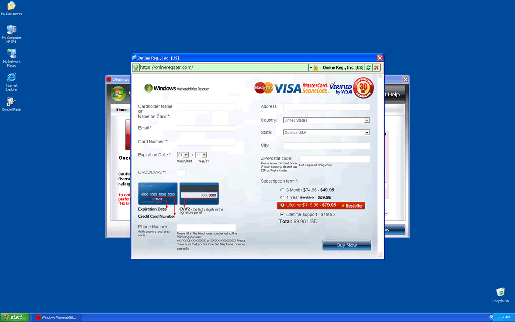 Windows Vulnerabilities Rescuer is a fake anti-spyware application that uses aggressive and tricky advertising through fake pop-up security alerts specifying computer system and hard drive errors. Windows Vulnerabilities Rescuer blocks other security programs from running and hijacks your desktop and web browser settings. Windows Vulnerabilities Rescuer propagates through fake codec updates and malicious websites. Windows Vulnerabilities Rescuer may also be installed by a Trojan infection, come bundled with other software, or install itself through a web browser security holes. Windows Vulnerabilities Rescuer steals confidential data from an affected computer by controlling a user's online activities. Windows Vulnerabilities Rescuer may be able to make your computer vulnerable to remote attacks which could cause loss of money, possibly identity theft, and, eventually, a complicated Windows Vulnerabilities Rescuer removal process. Windows Vulnerabilities Rescuer blocks virus removal software, system utilities, Task Manager, and even changes your desktop wallpaper. If you click on any desktop icon, you'll receive a message that the application is malicious and that you should purchase Windows Vulnerabilities Rescuer to get rid of those threats.