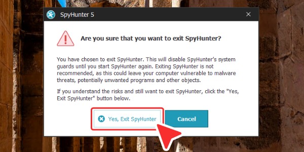 将会弹出一个窗口,告知您退出 SpyHunter 可能带来的不利影响。 -