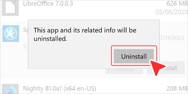 在出现的“此应用及相关信息将被卸载”提示中,单击“卸载”按钮。如果出现提示,请在 Windows 生成的用户帐户控制提示中单击“是”。 -