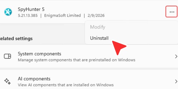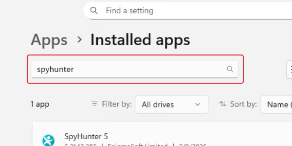 在“应用 -> 已安装的应用”下方的“搜索应用”搜索栏中输入“ SpyHunter ”,找到“ SpyHunter ”。点击“ SpyHunter ”右侧的“三个点”图标,然后选择“卸载”。 -