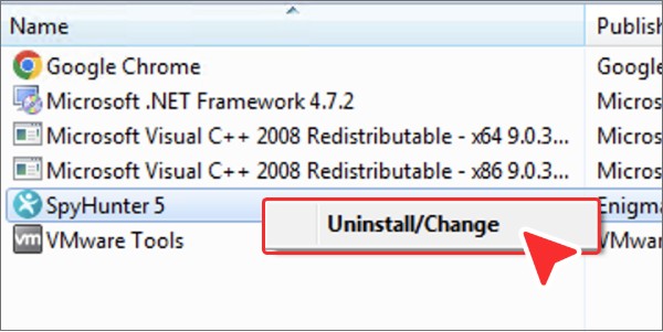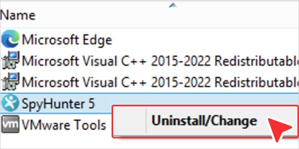在“卸载或更改程序”窗口中,找到“ SpyHunter ”,右键单击它,然后在右键菜单中选择“卸载/更改”。 -